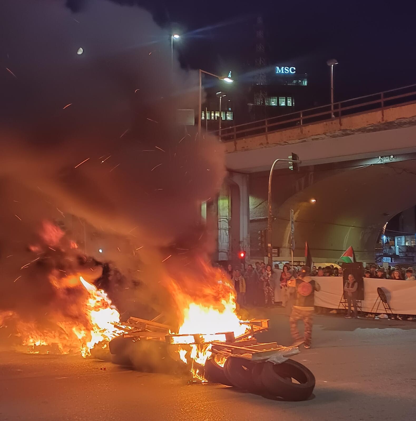 “Difendiamo la Flotilla, blocchiamo il porto”. È l’invito alla mobilitazione questa sera, a partire dalle 22, della USB a Genova, dopo le notizie del fermo imposto da Israele alle navi della flotta umanitaria. A bordo dei vascelli anche il ligure Josè Nivoi, portavoce del Calp, Collettivo autonomo lavoratori portuali. Davanti alla sede di Music For Peace è stato acceso un enorme fuoco con legno e copertoni e sono stati intonati cori a sostegno della Palestina. In piazza giovani e meno giovani con tantissime bandiere della Palestina. Il varco portuale Albertazzi è bloccato.