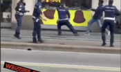 Prima ha lanciato con forza una bottiglia, poi ha raccolto da terra un asse di legno per colpire gli agenti. Un agente è stato colpito alla testa, riportando una ferita, un altro agente è stato raggiunto al gomito, nel tentativo di difendersi.