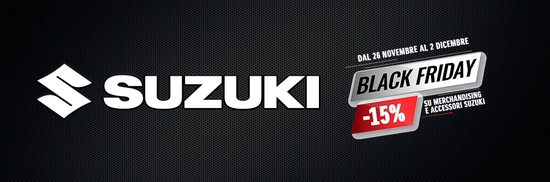 Suzuki pensa agli accessori (auto e moto) e all’abbigliamento: da martedì 26 novembre a lunedì 2 dicembre, utilizzando il codice promozionale BLACKSUZUKI, si riceverà automaticamente al momento del pagamento, uno sconto del 15% sullo shop online. Qui le istruzioni per sfruttare l’offerta.