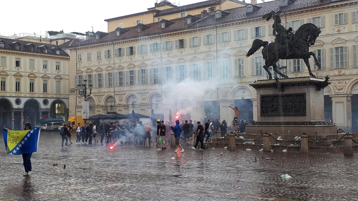 TORINO – Centinaia di tifosi della Bosnia, fra i quali molti indossano le maglie nere degli ultrá con la scritta Away Days, si sono radunati in piazza San Carlo, nel centro di Torino, in attesa della partita di stasera per le qualificazioni agli europei del 2020 contro l’Italia. Per la pioggia si sono spostati sotto i portici dove alcuni hanno esploso qualche petardo tra i tavolini dei bar. Molti hanno bottiglie di alcolici in mano, ma la situazione al momento pare tranquilla. La piazza é presidiata dalla polizia che, a distanza, controlla i tifosi bosniaci. Un gruppo di ultrà ha appeso la bandiera con la scritta Kljuc, nome di una città bosniaca, sul monumento equestre in piazza San Carlo.
