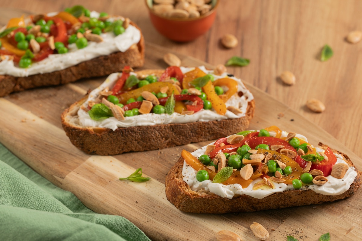 Pane casereccio 4 fetteFormaggio spalmabile vegetale Philadelphia 250 gPeperoni rossi 1Peperoni gialli 1Pisellini 150 g (da sgranare)Mandorle pelate 40 g tostateMenta q.b.Olio extravergine d’oliva q.b.Sale fino q.b.Pepe nero q.b.