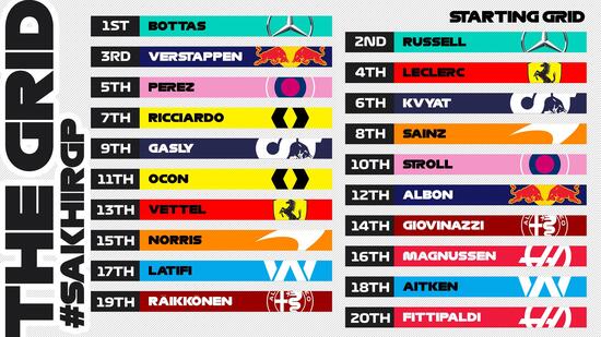 Sarà Valtteri Bottas a scattare dalla pole position nel Gran Premio di Sakhir 2020 di Formula 1. Accanto a lui in prima fila il compagno di squadra, George Russell, che sostituisce Lewis Hamilton, positivo al COVID-19. Terza posizione per Max Verstappen, della Red Bull, davanti al monegasco della Ferrari, Charles Leclerc. Quinto è Sergio Perez, della Racing Point, davanti a Daniil Kvyat, dell’Alpha Tauri, e Daniel Ricciardo, della Renault. Completano la top ten Carlos Sainz, della McLaren; Pierre Gasly, dell’Alpha Tauri; e Lance Stroll, della Racing Point.