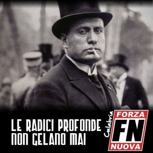 Un manifesto con la foto di Benito Mussolini e la scritta “Le radici profonde non gelano mai” (citazione dello scrittore inglese J. R.R. Tolkien). È la campagna di Forza Nuova Calabria per il tesseramento regionale 2019. La prima, nella storia del partito neofascista guidato dall’ex terrorista nero Roberto Fiore, dove viene utilizzata in modo esplicito l’immagine del duce. L’effigie del dittatore è in bianco e nero: vestito elegante, cappotto, cravatta, bombetta in testa, sigaretta tra le labbra. A dare un senso alla locandina è una delle frasi celebri di Tolkien, adottato da anni come riferimento letterario dall’area “identitaria” e dell’estrema destra.