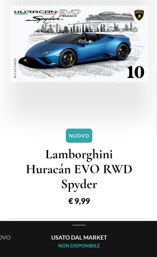 Ci si ritrova facili e immediati possessori al prezzo di soli 10 euro. Certo, è molto abbordabile ma anche infinitamente “meno” di una vera Huracàn con il V10, quella in formato francobollo digitale. Ma è pur sempre Lambo, con benestare della Casa e non a caso, costa già il doppio di altri francobolli presenti sula stessa piattaforma online, pur se gli stessi sono in tiratura inferiore.