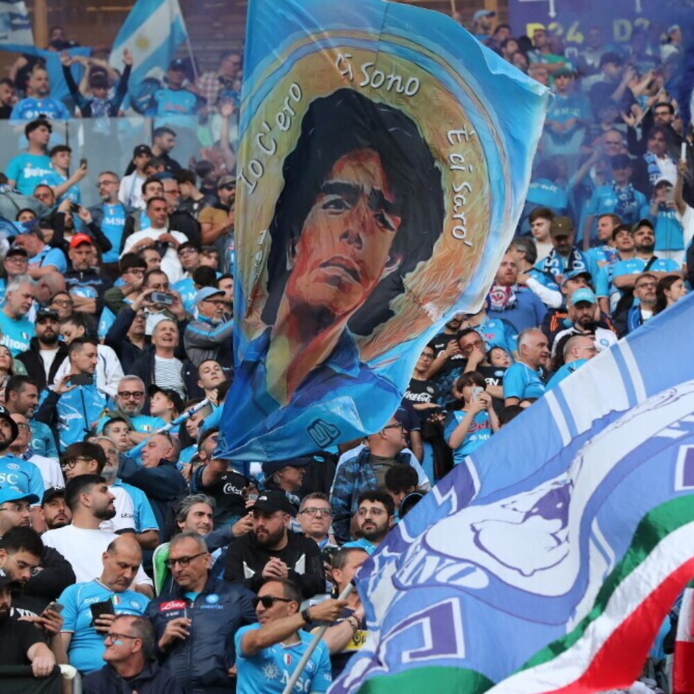 Al centro della piazza, tra i motorini che sfrecciano, vengono accesi i fuochi pirotecnici, che illuminano il cielo. Le urla di gioia dei tifosi azzurri sono un modo per spazzare via definitivamente quell’ansia e quella tensione accumulate nelle ultime settimane. C’è anche una tifosa con la maglia di Oshimen e una parrucca che ricorda i riccioli di Maradona. Salta e si abbraccia con un ragazzo che ha la maglia di McTominay. La storia, il recente passato e il presente della Napoli calcistica. Il tricolore con al centro il numero 4 era già stato esposto prima dell’inizio della partita, a Forcella, a Chiaia, come in altre parti della città, perchè il valore della squadra di Conte e la voglia di festeggiare sono sempre stati più della scaramanzia