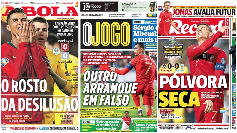 ROMA – Il ritorno di Cristiano Ronaldo non è riuscito a sfatare il tabù del Portogallo che, sottolinea oggi la stampa lusitana, contro l’Ucraina non è andato oltre un poco emozionante 0-0 casalingo, confermando le difficoltà nella partita d’esordio per le qualificazioni all’Europeo: solo quattro vittorie in 15 precedenti. Per ‘A Bola’ quello di CR7 è “il volto della disillusione“, strilla il titolo in prima pagina, a corredo di una foto che ne mostra la stizza dopo un’occasione fallita.