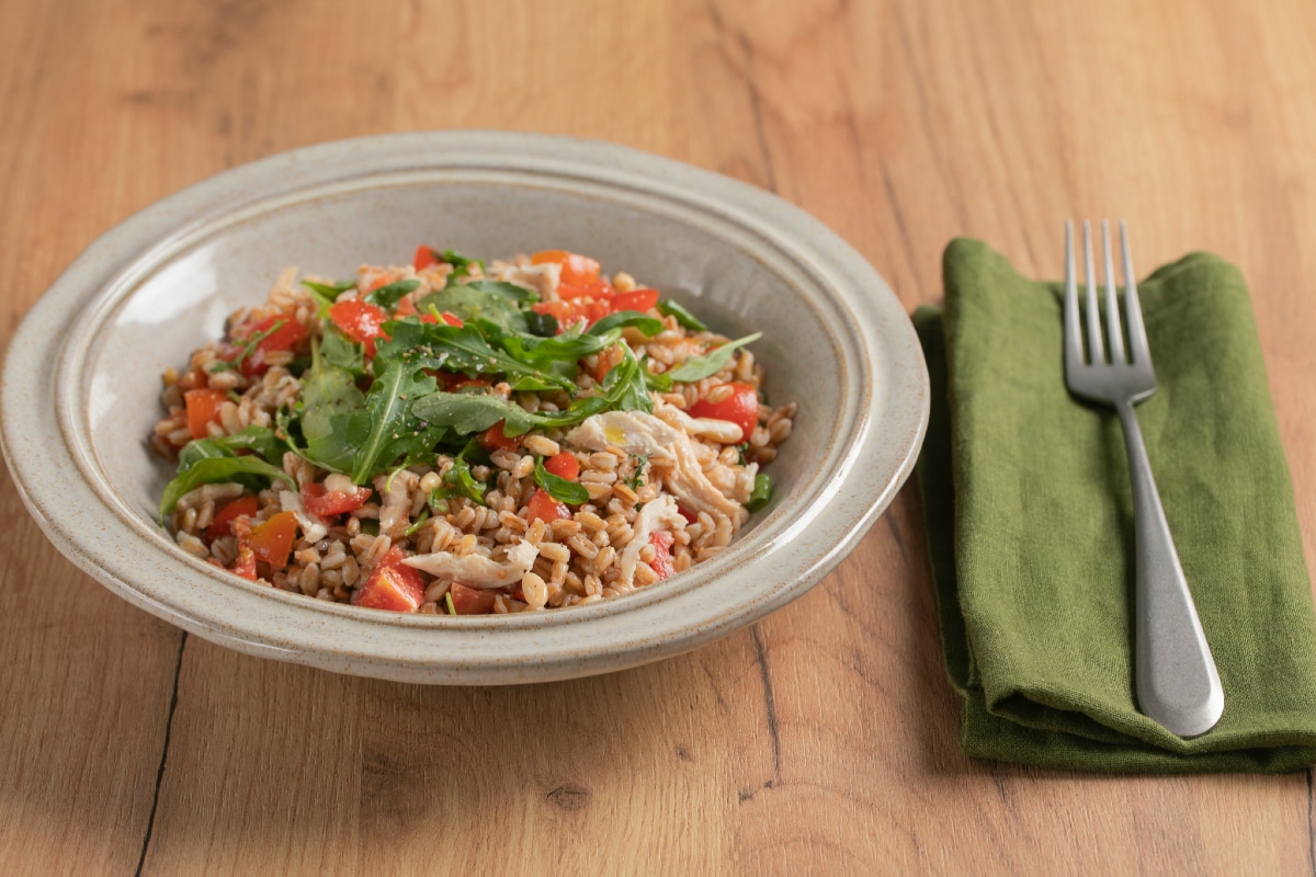 Petto di pollo 300 gFarro perlato 250 gPomodorini ciliegino 200 gRucola 1 mazzettoMandorle pelate 40 gPinoli 20 gAcqua 1 lOlio extravergine d’oliva q.b.Sale fino q.b.Pepe nero q.b.