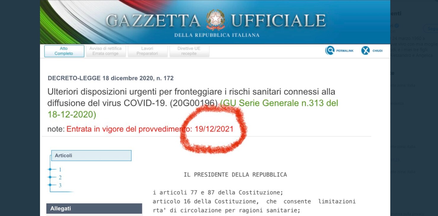Grossolano errore sulla Gazzetta Ufficiale per quanto riguarda il Decreto Natale. Secondo quanto si leggeva nelle note del provvedimento, che contiene le misure da adottare durante le feste, l’entrata in vigore era prevista il 19 dicembre 2021. Il refuso ovviamente non è sfuggito e anzi da ore rimbalza sui social, diventando oggetto di ironia, accese discussioni e critiche feroci. Anche il sindaco di Bergamo, Giorgio Gori, ha sottolineato l’errore: “E per un anno… liberi tutti!“.