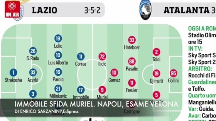 ROMA – Inizia alle 15 allo stadio Olimpico con la sfida tra Lazio e Atalanta l’ottava giornata di campionato di SerieA. Biancocelesti senza lo squalificato Leiva al suo posto in cabina di regia ci sarà Parolo. Lazzari e Correa favoriti rispettivamente su Marusic e Caicedo. In difesa LuizFelipe completerà il reparto formato da Acerbi e Radu. Gasperini senza l’infortunato Zapata, i attacco Muriel al fianco di Ilicic. In difesa Masiello, Djimsiti e Toloi nel mezzo Freuler favorito su De Roon.