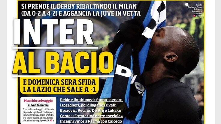 ROMA – “Inter al bacio”, questo il titolo in prima pagina sul Corriere dello Sport oggi in edicola. La squadra di Conte batte il Milan ribaltando il derby, da 0-2 a 4-2 e aggancia la Juve in testa alla classifica. Rebic e Ibrahimovic fanno sognare Pioli, ma nel secondo tempo i nerazzurri dilagano con Brozovic, Vecino, De Vrij e Lukaku. Conte ammette: “È stata una notte speciale, stiamo crescendo, anche se è presto parlare di Scudetto“. Domenica sera sfida ad alta quota all’Olimpico contro la Lazio, salita a -1 dalla vetta dopo il successo contro il Parma firmato Caicedo.