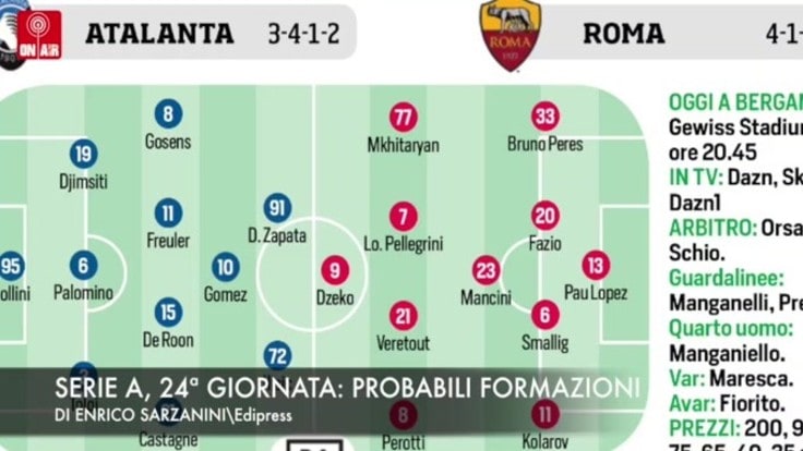 ROMA – Sarà la sfida Champions tra Atalanta e Roma delle 20.45 il piatto forte di questo sabato di anticipi: tutti a disposizione per Gasperini che, nonostante la gara di Champions di mercoledì contro il Valencia, non farà turn over: Gollini in porta, in difesa Toloi, Palomino e Djimsiti. A centrocampo Castagne, De Roon, Freuler e Gosens, in attacco Gomez alle spalle di Ilicic e Zapata. Roma senza Cristante squalificato e Diawara infortunato con Pau Lopez in porta, Mancini davanti a una difesa con Peres, Fazio, Smalling e Kolarov. Nel mezzo Mkhitaryan, Pellegrini, Veretout e Perotti con Dzeko unica punta.