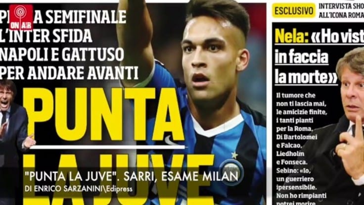 ROMA – “Punta la Juve”. Questo il titolo di apertura del ‘Corriere dello Sport’ oggi in edicola e dedicato all’Inter che questa sera a San Siro ospita il Napoli nelle semifinali di andata di Coppa Italia: il tecnico nerazzurro Conte schiera la formazione migliore con l’obiettivo di centrare la finale dove potrebbe affrontare la Juve che domani sfida il Milan. Di spalla intervista esclusiva a Sebino Nela che racconta la sua battaglia contro un tumore: “Ho visto la morte in faccia”.
