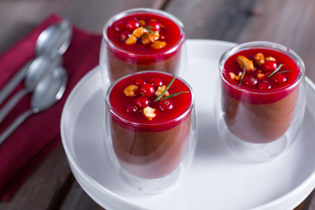 Guarnite con qualche bacca di ribes (19) e qualche ago di rosmarino (20). La vostra mousse al cioccolato all’olio con coulis di ribes è pronta per essere servita (21)!