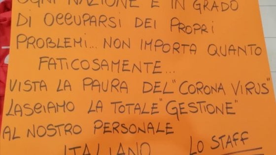 “Ogni nazione è in grado di occuparsi dei propri problemi, non importa quanto faticosamente. Vista la paura del coronavirus lasciamo la totale gestione al nostro personale italiano. Lo staff”. E’ quanto riporta un cartello affisso all’ingresso di ‘Mio Market’, un grande negozio gestito da cittadini cinesi che sorge nel centro commerciale di Cavallino e che vende articoli di vario genere.