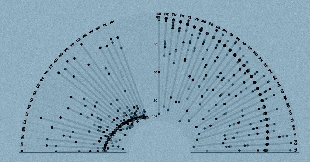 Per ciascuno dei 90 indicatori, mille punti vengono dati alla provincia con il valore migliore e zero punti a quella con il peggiore. Il punteggio per le altre province si distribuisce in funzione della distanza rispetto agli estremi (1000 e 0). In seguito, per ciascuna delle sei macro-categorie di settore, si individua una graduatoria determinata dal punteggio medio riportato nei 15 indicatori, ciascuno pesato in modo uguale all’altro (quest’anno ad eccezione di uno, vedi sotto). Infine, la classifica finale è costruita in base alla media aritmetica semplice delle sei graduatorie di settore. I dati aggiornati al 2020Di solito l’indagine della Qualità della vita, pubblicata alla fine dell’anno in corso, prende in esame i dati consolidati relativi ai 12 mesi precedenti. Quest’anno, però, le sole performance del 2019 sarebbero risultate superate da un’attualità dirompente: per valutare l’impatto della pandemia esplosa a febbraio è stato necessario utilizzare dati il più possibile aggiornati in tempo reale. Così, nell’indagine si contano ben 56 indicatori su 90 riferiti al 2020, aggiornati a metà anno, se non addirittura per alcuni a ottobre-novembre.