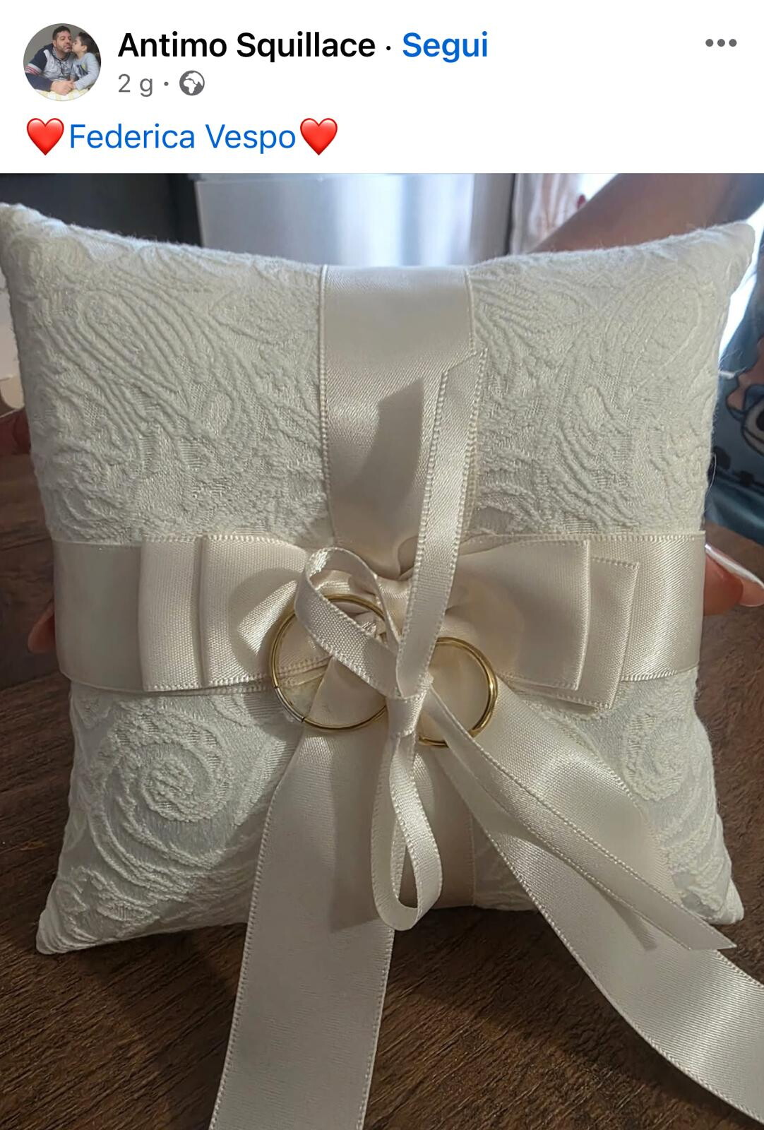 “Ho perso un amico di quelli veri con cui sono cresciuto giocando e ridendo. Oggi non ci sei più e fa male. La vita ci ricorda che siamo di passaggio ma i ricordi resteranno per sempre. Ciao Antimo”. Parole semplici, quelle di Davide, amico dello sposo, a ricordare quanto vita e morte siano intrecciata proprio come le fedi sul cuscino fotografato dallo sposo.