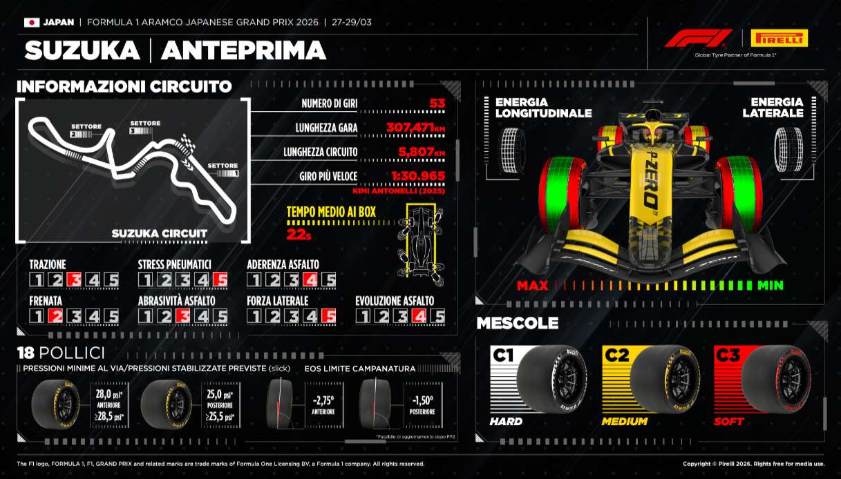 A Suzuka non vince solo la monoposto più veloce o il pilota più coraggioso, spesso decide la gomma giusta al momento giusto. Il GP del Giappone riporta la F1 su uno dei templi tecnici del calendario e mai come quest’anno la sfida passa dagli pneumatici. Per affrontare i 5,807 chilometri del tracciato nipponico, Pirelli porta la selezione più dura dell’intera gamma: C1, C2 e C3, rispettivamente Hard, Medium e Soft. Una scelta netta, quasi identitaria, per domare una pista che non perdona errori e che mette sotto stress ogni componente della monoposto.