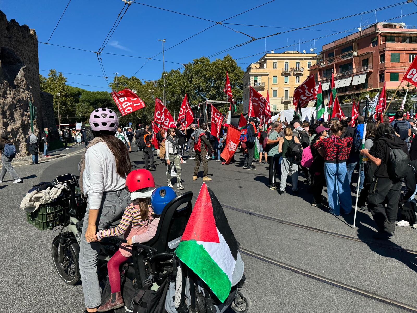 Tra un kebab e una birra sventolano numerose le bandiere della Palestina insieme a quelle dei sindacati (Cobas) e ai colori arcobaleno. In sottofondo i cori “Palestina libera” accompagnati da musica araba.E l’ipotesi di prolungare il percorso oltre San Giovanni.